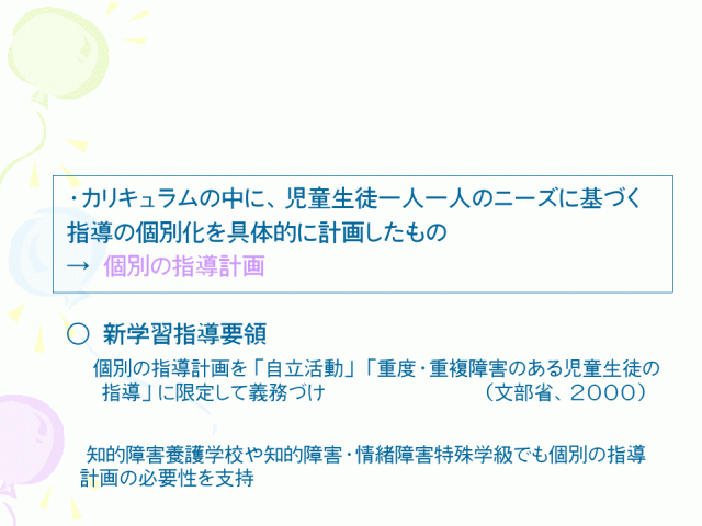 定義を言えば子ども一人一人のニーズに基づく指導の個別化を具体的に計画したもの。つまり、さっきの赤い丸というのは子どもによって大きい・小さい、質、量とも違うわけですので、たくさん援助が必要な子どももいればほんのちょっとで済む子もいる、複数の支援が必要な子どももいればひとつだけで済む場合もあるというように、子どもによって千差万別ということですから、それぞれの子どものニーズに基づいて作成しなければならない、だから個別の指導計画、個別に作られる指導計画だということです。
