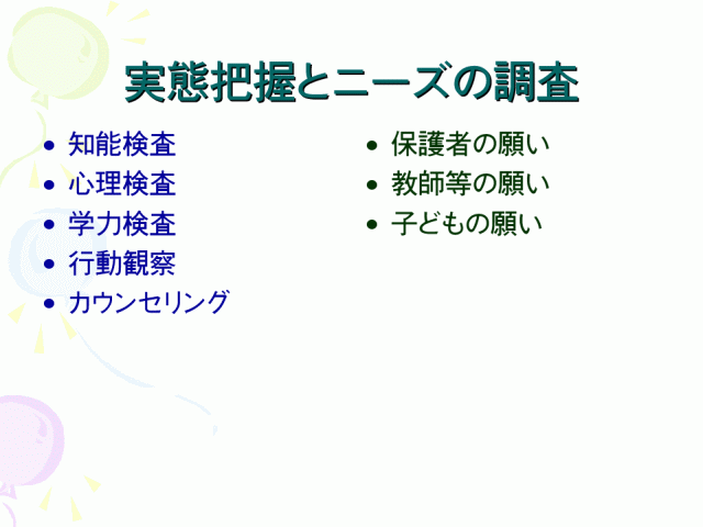まず、子どもの実態を把握するということで、どんな子供なのか?二つ目はどんなことが必要か?という、ニーズの調査というものをします。