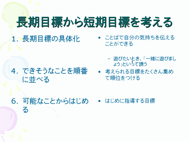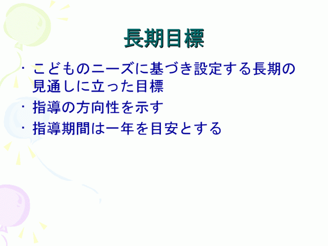 今のは長期目標といいまして、大体一年間を視野に置いた目標といえます。子どものニーズに基づいて設定する長期の見通しに立った目標、だから今すぐ出来なくてもいいわけです。こういうものに近づいてくれればいいぞ、ということですから教師からすると指導の方向性を示します。こんな子どもにしたい、自分はこういうふうに指導するんだという方向性を示します。学校の場合には、やはり一年毎に見直した方がいいだろうということなので、大体一年後こういうふうになってほしいというような期間で取り組みます。