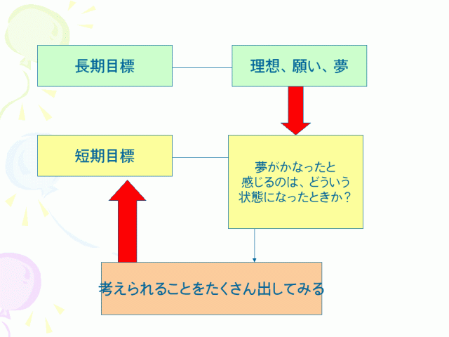 長期目標を立てるとその次に短期目標という具体的な目標を立てることになるんですが、これがなかなか難しい作業だと思います。長期の目標は言い換えると理想であり、願いであり、夢なんです。極端な話、達成されなくてもいいんだと。この夢に向かって一歩でも近づけば、それでまあまあいいんだろうと考えていただきたいと思います。しかし短期目標というのはやはり確実に達成しなければいけないものです。「ちょっと近づいたから良かったですね」じゃあ済まない。では、長期目標から短期目標を設定するためにどうすればいいのかということなんですが、この「長期目標」は夢ですから、夢がかなったと感じる時はどういう状態の時かをちょっとイメージしてみます。