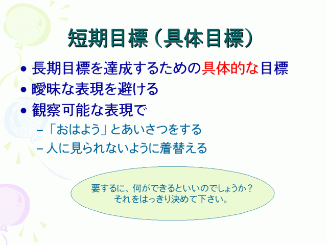 短期目標は言い換えると具体的な目標です。曖昧な表現を避けます。長期目標を達成する為に必要な具体的な目標、曖昧な表現は避ける、観察可能な表現で書くということです。