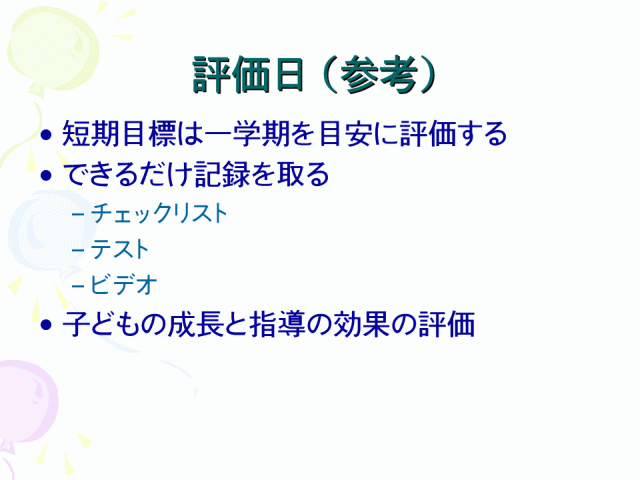 短期目標は1学期をめやすに評価します。そのためにもできるだけ記録を取ります。チェックリストを作ってチェックしていくことも考えられますし、教科学習の場合にはテストをして今回は30点取れたというようなことも出来ます。どんな子供にも使えるのがビデオです。私がよく勧めるのは小学校に上がったときにまず子供に好き放題させて、危なくないようにさせて、それをビデオにずっと撮っていくわけです。そして1学期が終わった頃にもう一回同じ場面で撮ると、どれだけ変わったかということが分かるわけです。そういうポイント・ポイントを決めてビデオに同じ場面を撮って見比べてみると、子供の成長がどんな子供についても把握できるかと思います。