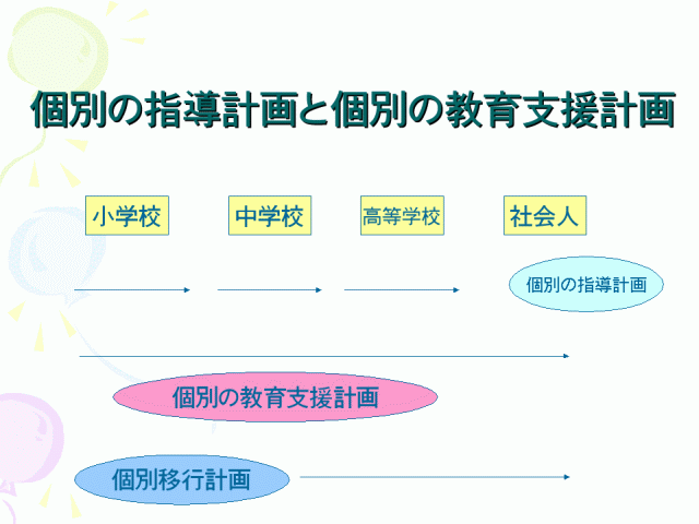 そのなかには個別の移行計画というものがあって、これはようするに個別の進路指導計画です。子供が将来どういう仕事に就いて、あるいはどういう学校を選んで、どういう仕事を選んで、将来どういう生活をするかを中学校くらいから考えましょう、ということです。ですから個別の教育支援計画のなかに移行計画も含まれるというふうに考えていただいてけっこうです。2つの要素が入っていて非常に心強いものです。