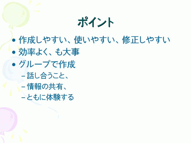 個別の指導計画を作成する場合にポイントがいくつかあります。「作りやすい」こと、作るのに1学期間かかりましたというのでは本末転倒なんですね。そのうちに子供がどんどん変わっていって目標が合わなくなっていた、ということもあり得ます。ですからとにかく作成しやすいもの。2つめのポイントとして「使いやすい」こと、出来て、大事に金庫に眠らせておくというものでは困ります。あとは「あ、この目標おかしかった」というときに「修正しやすい」ということです。従いまして、手書きよりもワープロ・パソコンで作ると修正しやすいです。それから「効率よく」というのも大事です。やはり、時間をかければいいというものではないです。まずパーッと作ってみて、やってみてダメだったら修正、というくらい機動力があった方がいいと思います。練って練って慎重に慎重を重ねて、出来たときには秋風が吹いていたというのはちょっと洒落になりませんので、まずは作るということです。一人で悶々として作るとあまりいいことはありませんので、出来るだけグループで作成する、話し合うことです。ここで大事なことは問題解決を最優先するということです。何か意見を出すと「出来なかったらどうするの?」とか「それはこういう問題点があるんじゃないの?」と、必ず足を引っ張りたくなります。何か目標を出した、「それは先生が今までやってこなかったのが悪いんじゃないですか?」となると、その後泥沼になりますので、そうじゃなくて、この目標を達成するためにどうしたらいいかという未来だけを見てやっていただきたいということです。過去のことをあーだこーだと言ってもしょうがないわけです。従いまして、話し合うときのポイントとしては、人の足を引っ張るような意見はなるべく言わないことです。ただ、「この子の特性から見てこの目標はどうしても合わないと思いますよ」とかそういうのは言っても構いません。こんなふうに個別の指導計画を作るというのは情報の共有をするということになります。ひとつのこういう文書を家庭や学校・職員のあいだで共有するということなんですね。同じように指導できますし、共通理解が具体的に保証されます。ともに体験することが出来ます。ですからこれは必ず必要なものと考えていただきたいと思います。
